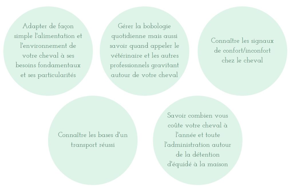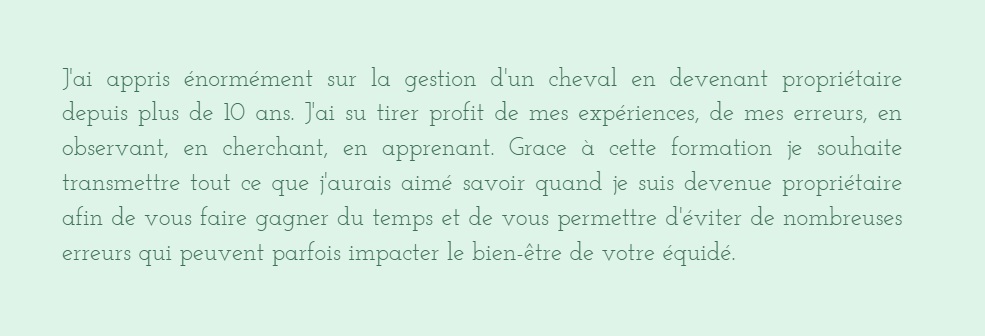 Cette formation en ligne a pour vocation d ‘apprendre aux propriétaires d ‘équidé à respecter le bien-être de leur partenaire et d ‘être autonome dans la gestion quotidienne de ce dernier.